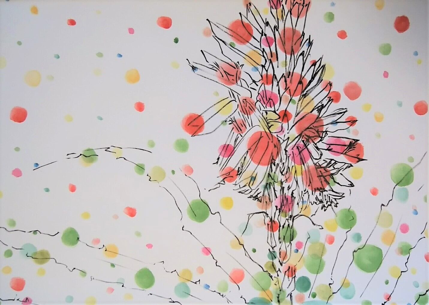 墨・水彩・紙 黒縁の額に入れて発送。 サイズ:29㎝ x 40cm (額込み) (枠からの余白なし) 額無しや額変更をご希望の方はご連絡ください。その際、値段も変わります。