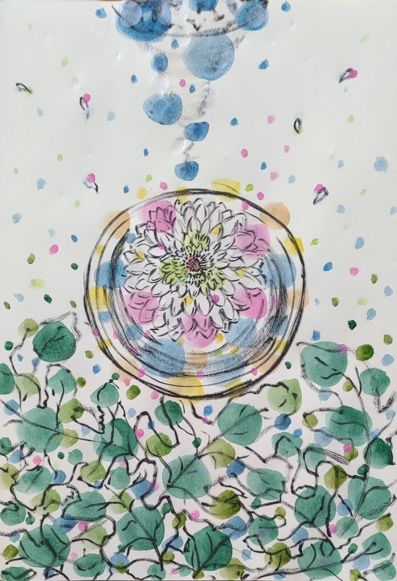 素材:墨・水彩・紙 額に入れて発送。 サイズ25㎝ x 19cm(額込み)(枠から絵までの余白無しの場合) 額無しや額変更をご希望の方はご連絡ください。その際、値段も変わります。